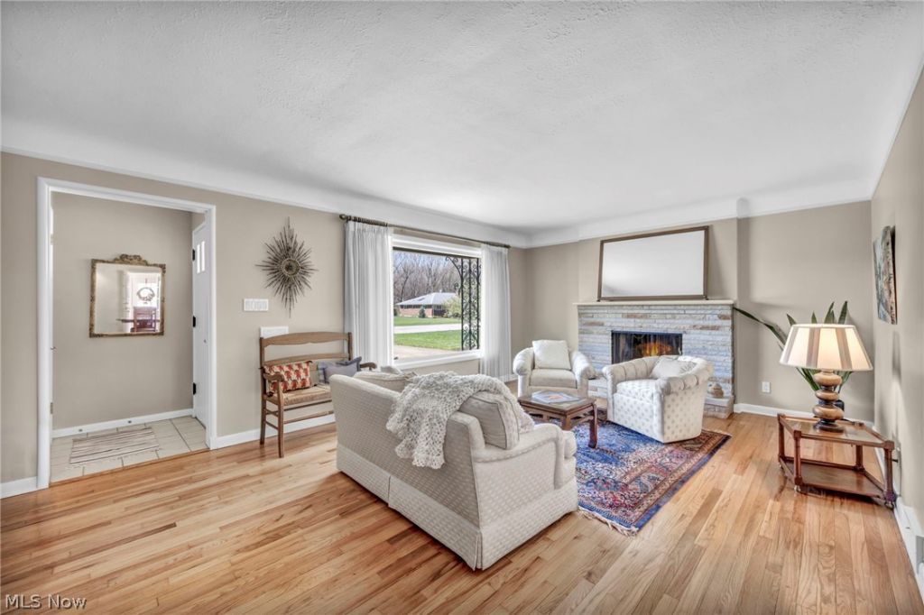 Welcome to this beautifully maintained all-brick ranch nestled in a prime North Olmsted location just minutes from Great Northern Mall, Metroparks trails, and quick access to I-480 and I-90 for an easy commute. Offering timeless charm and pride of ownership throughout, this home features a welcoming front porch and newer concrete driveway that set the tone from the start. Step inside to a true foyer entry?rare for a ranch?providing a warm and functional transition into the home. The spacious living room is filled with natural light from a large picturesque window and anchored by a classic wood-burning fireplace, flowing seamlessly into the formal dining room?perfect for everyday living or entertaining. Gorgeous, gleaming original hardwood floors span the entire main level, complemented by clean baseboards and molding that add character throughout. Just off the dining room, enjoy a cozy enclosed sun porch with a ceiling fan and walls of windows overlooking the large, manicured, partially fenced backyard with a concrete patio?ideal for relaxing or hosting. The kitchen offers abundant cabinet and countertop space, room for an eat-in area, and comes fully equipped with a dishwasher, microwave, range, and refrigerator. A conveniently located and updated powder room sits just off the kitchen. Two generously sized bedrooms feature ceiling fans, ample closet space, and great natural light, while the full bath showcases timeless mosaic tile flooring. The basement expands your living space with a partially finished rec room featuring a second fireplace, plus a large unfinished area for storage along with a newer washer and dryer. Additional highlights include Andersen windows and doors, a 200-amp electrical panel, and a home that has been exceptionally cared for over the years. This is a rare opportunity to own a solid, character-filled ranch in a highly convenient and sought-after location.